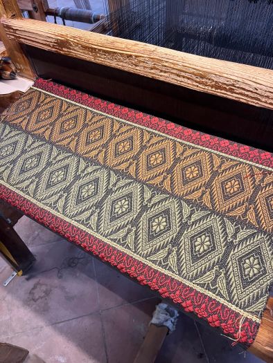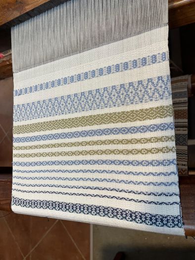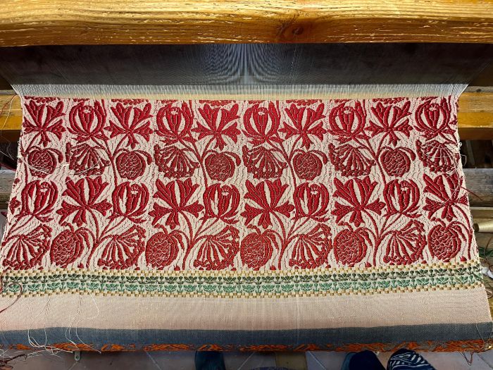 True to form, she’s been very productive and sent photos of the three projects she completed already. They are beautiful and quite complex pieces done on an antique Jacquard loom that is hundreds of years old.