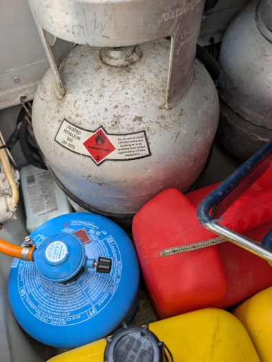 These tanks, the little blue one, are generally sold as a swap of an empty one for a full one. Not too big, I guess less than half of the volume of my 20lb US tanks. Note that the regulator is on top of the tank. It’s different than the one on the propane system and butane, is stored under less pressure than propane and has somewhat different characteristics than propane. However, I checked and learned that my Force 10 stove would be able to handle both types. Note that these tanks are actually designed for camping use and the regulator screws directly into the top of the tank. They have tanks that are large like the ones I have already but getting them filled means sending them out and waiting to get them back. With all of the complexity so far, I’m going for simple…