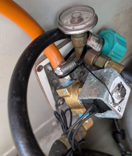 Well, it’s all hooked up now and seems to be working just fine. I plumbed the new hose, orange, directly to my shutoff solonoid valve so there is always a positive shutoff in the line when it’s not being used, a very important safety feature. I also left the US regulator in place, which I can swap back into service in about 30 minutes. that’s important as my second 20lb US tank is basically full so if I run out of the blue tank when I don’t have easy access to a new bottle, I can still reconnect my full US tank.