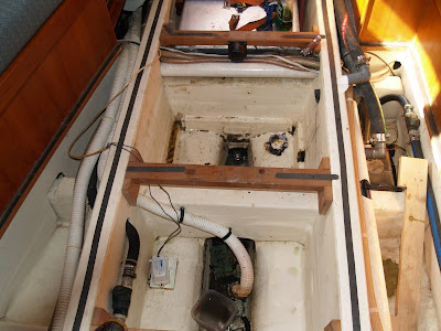 My to-do list for my visit last weekend was to remove a leaky holding tank so that I could have a new one made that would allow for greater capacity. While the tank is out I also needed to clean up a messy bilge from years of seepage and other lovely problems related to storing raw sewage aboard. The bilge had gotten a bit smelly and needed attention. The tank came out fairly easily and with a bit of work I was able to fit a cardboard template into the spot.