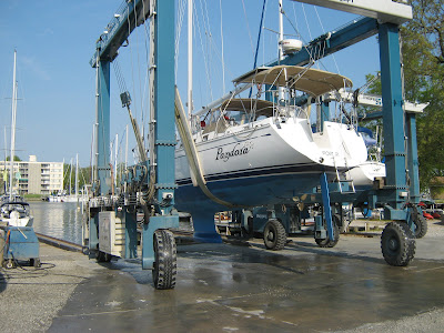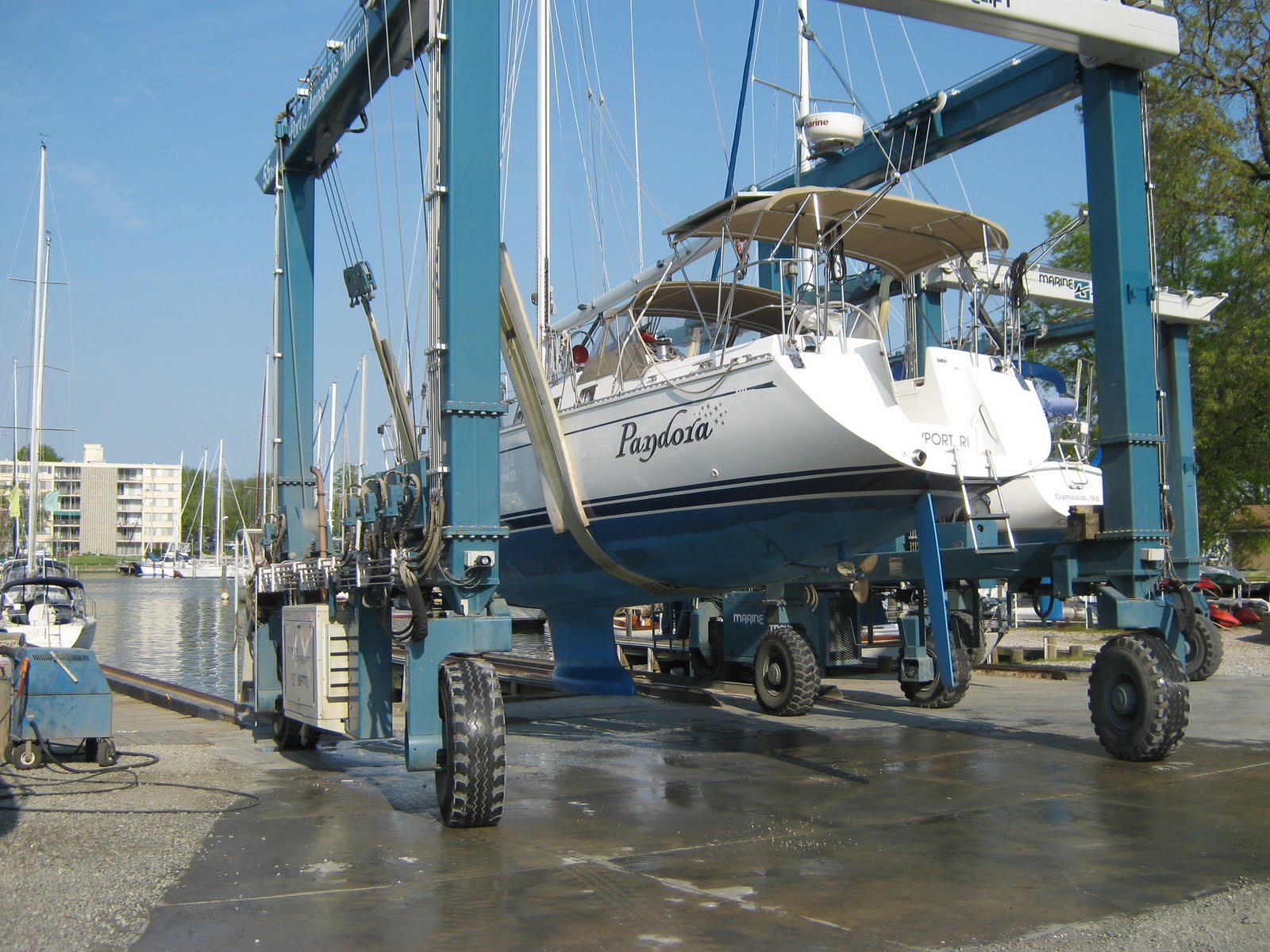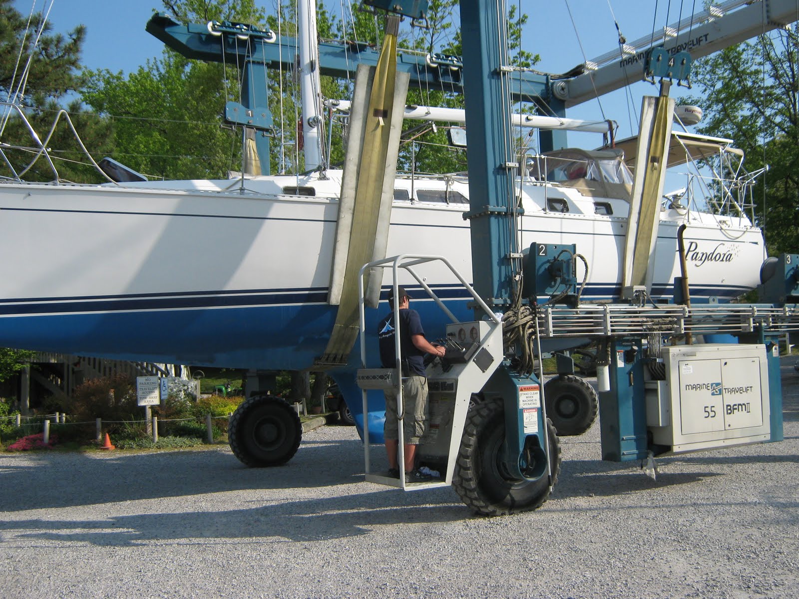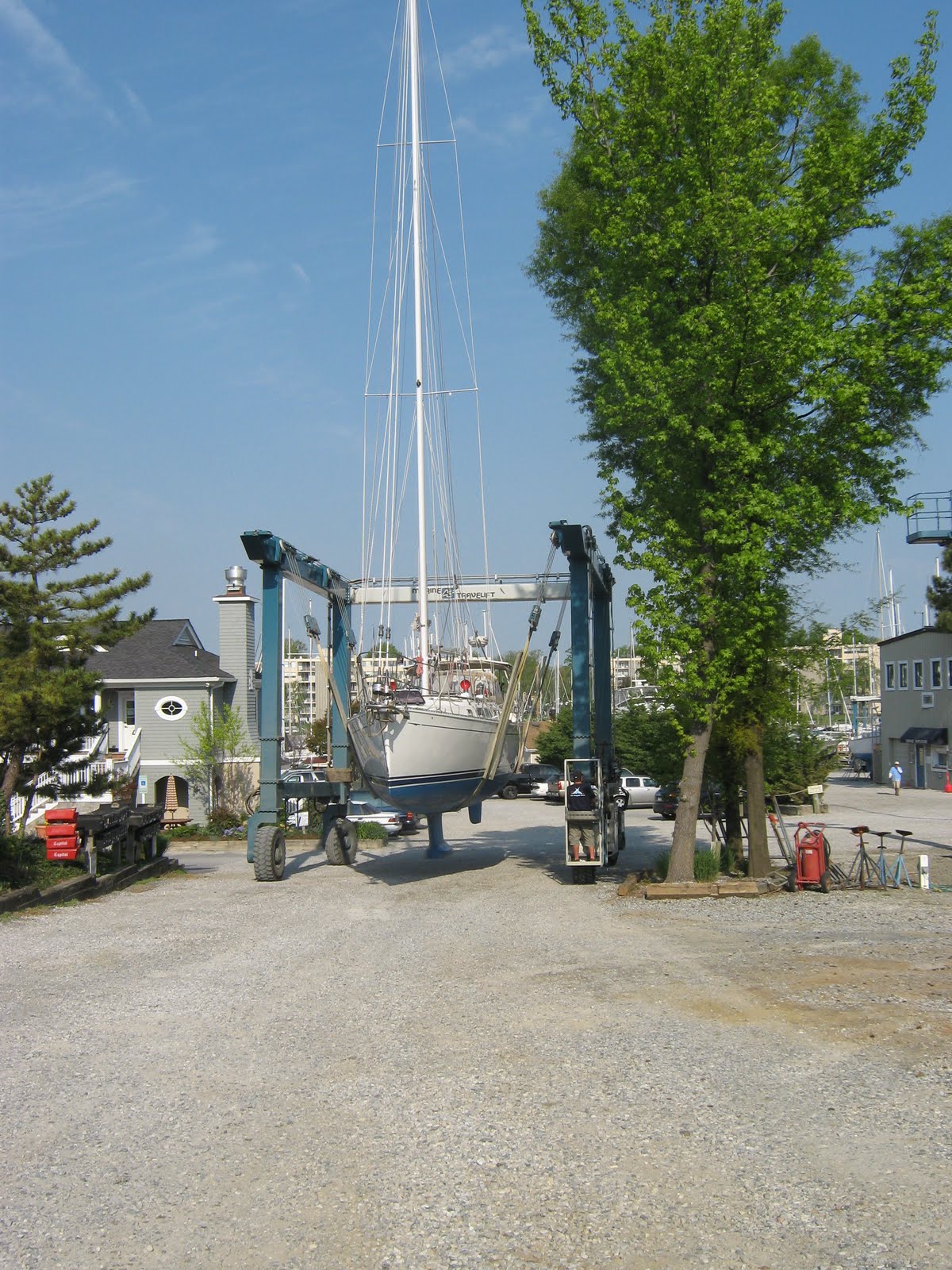 >Pandora launched as planned on Friday morning in Annapolis. After all of the preparation it always amazes me how quickly it all happened and then we are floating. With months of preparation and organization when it comes time to launch. The guys show up with the lift, rig up the straps and off they go. Aside from my sanding and painting the underside of the keel, the whole project couldn’t have taken more than 15 minutes from when they showed up until Pandora was afloat.