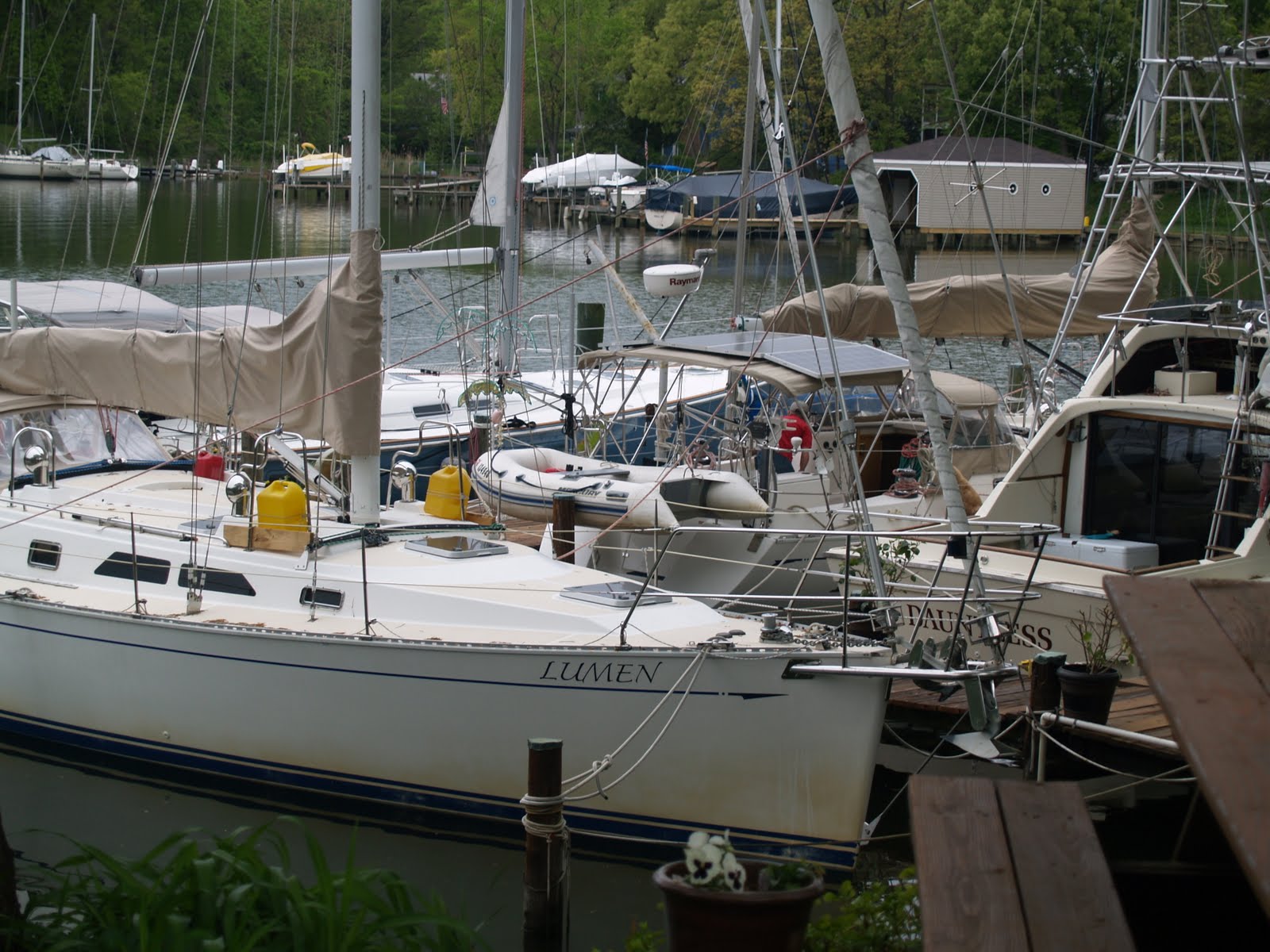 Until mid June Pandora’s home port will be Sprig’s pond near Annapolis in a slip. Here’s a shot of Pandora (across the dock, stern too) near Lumen, another SAGA 43. Lumen is just visiting as her owner Peter recently arrived from Florida where he had her for the winter. Peter keeps Lumen in Maine and will be back in a few weeks to continue his trip back home.