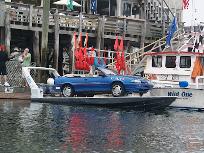 I was particularly amused by this sight as it “motored” by the other morning. Is it a car, a boat? It’s tacky and wonderful, that’s for sure. I guess it’s a caboat. No kidding, it’s steered from inside the car by wheel. Notice the Maine registration on the front fender. Good thing that it has a spoiler on back to help control it at speed.