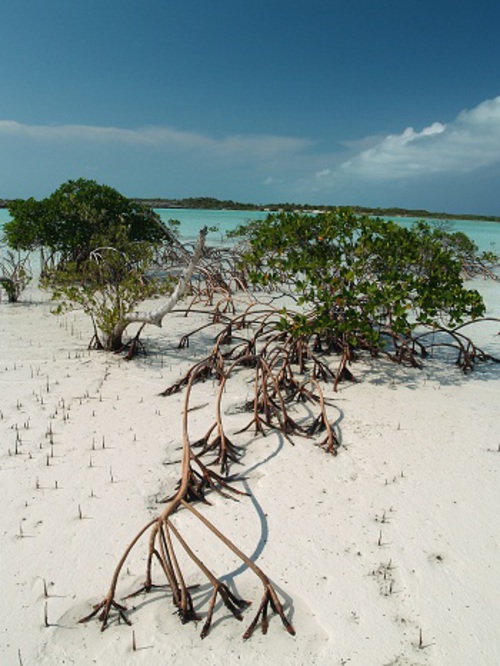 On Monday, after a terrific Easter Sunday celebration pot luck at the park warden’s home with perhaps 50 or so other cruisers, we headed over to Shroud Cay, another island in the park but one that is primarily a mangrove swamp.  There are channels meandering through the mangroves with water, at least at high tide, that is impossibly clear.  The roots of the mangroves make the most amazing sculptural sight.  The ariel roots help the plants roots get enough air and help excrete excess salt.   These are very tough plants and are critical to keeping islands from washing away in storms.   In fact, mangrove swamps are a great spot to tie up a boat to avoid a hurricane as they are very solidly rooted and you can tie up to them and be safe from a storm.  They also break waves and keep wind down.   Me, I am not planning to test this out any time soon.
