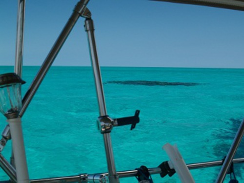 The good news is that with the clear waters of the Bahamas as our guide, seeing the coral heads was quite easy, assuming that the sun was shining, which it was.   These “heads” grow up out of the bottom and show like a sort of “ink spot” against the surrounding blue sandy bottom.    The contrast, under the right conditions, was marked.  This shot clearly shows how these dangerous spots show up.    What doesn’t show is just how many of them there were.  Happily, with some exceptions, they were separated by several hundred feet of clear water so avoiding them was easy even if it required constant vigilance.