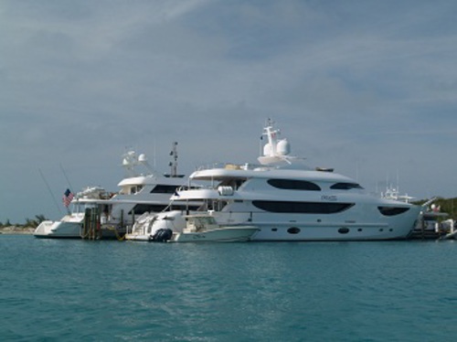 As I mentioned in my last post, we spent some time, three nights actually, at a really nice resort marina, Highbourne Cay Marina.   It was a real treat and the only time on this trip that we have spent any time in a marina, beyond Rum Cay which was free and didn’t count.   Highbourne Cay Marina is a first class spot and it was a real treat to have high quality meals and stay in such a lovely spot.  Pandora, while a decent size boat, was a peanut compared to the other boats in the harbor and for our first night, was the only sailboat.  I understand that one of the largest sports fisherman boats there, perhaps 100′ or so, was owned by the Bacardi family of Bacardi Rum fame.  There were some boats that were even larger so Pandora was clearly the dink of the marina.