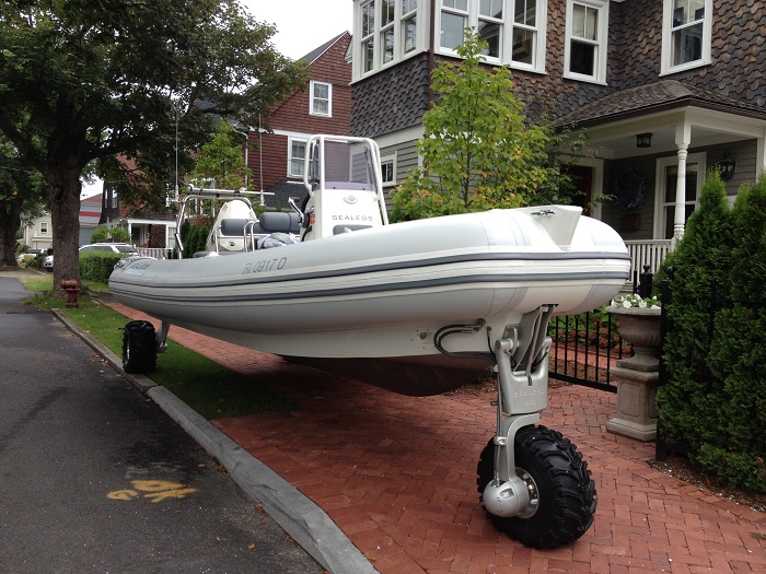 There’s a boat design for every occasion. How about this one that I saw at the boat show. This photo was taken in Wickford, where Pandora is now, after the show closed. It’s an HBI (hard bottom inflatable) with a twist. While it has an outboard to use when on the water, it also has a built in generator and hydraulics that power the wheels when it’s coming up the beach and on the roads. I wonder where the license plates go? Looks pretty complex to me. I’ll bet that they won’t have a big market. This baby has to be pretty pricey.