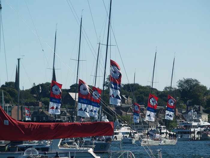 While we were there the New York Yacht Club was hosting races of their NY40s, a class of one-designs, all identical in design and outfitting. These boats, as they prepared to race, paraded around the harbor in numerical order with flags flying. Each boat has a number from one to twenty and they lined up in exact numerical order. I’ll bet that there is a bit of politics in the order of the boats. It’s probably better to be #1 than #20. However, there must be a ton of pressure on #1 to perform. They passed right by Pandora.