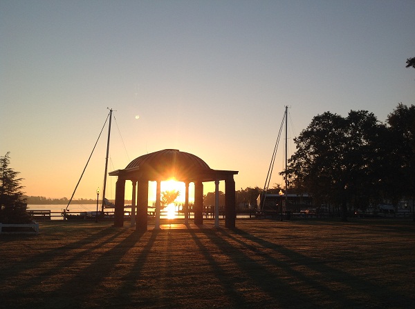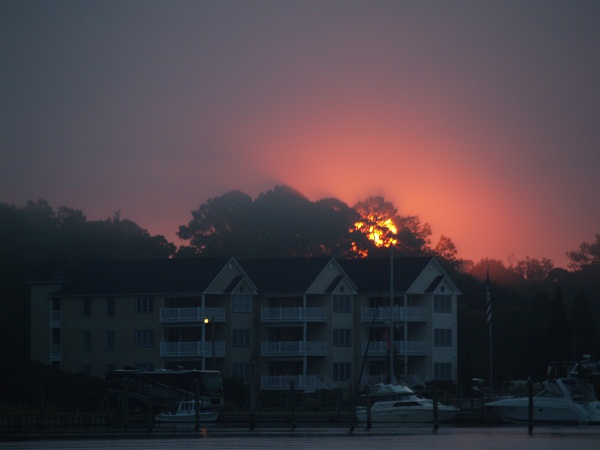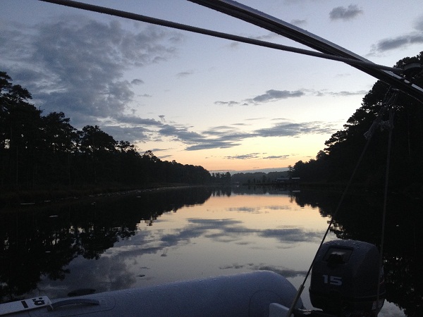 As we were preparing to head out today, we were treated to a wonderful sunrise over the waterfront park in Elizabeth City.  Pandora’s on the right. Nice place.This morning Ken  left Pandora to drive home as our run was taking more time than he had to commit to the trip.  As his schedule was really tighter than we both realized, it was unlikely that he’d be able to do the whole trip anyway.