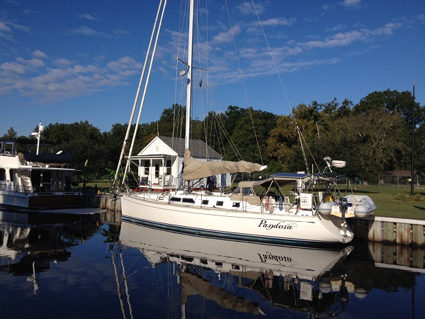 Here’s the sunrise just below the lock.  Beautiful and very peaceful.On a positive note, one of my favorite parts of the trip is seeing the Lock Tender Robert, as we enter the north lock of the canal. Robert is always good for a smile and warm greeting.   And this time, he even shared a Danish and cup of coffee with us.  What a great guy.   As if that wasn’t enough, he even agreed to do a “short” conch concert.  I hope to upload the clip soon but don’t have the bandwidth to do it right now.  You go Robert!!!Transiting the lock to the canal is a wonderful experience as we were lifted the 8’ to the swamp and then dropped down again at the other end.   Doesn’t Pandora look right at home in the lock?Ken enjoying a cup of Robert’s coffee.  Note the wall above Pandora. Now, in the full position, 8’ higher.  An impressive rise in only a few minutes.Pandora looking good in the lock and ready to go.On our way down the canal.  So smooth and peaceful. I guess that I’d better focus on where Pandora’s going and less on where she’s been.  Don’t want to run aground.  No wait, Jim’s at the helm.  Whew…