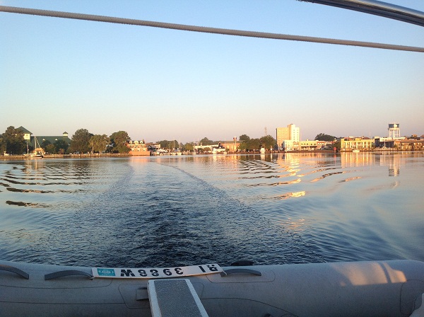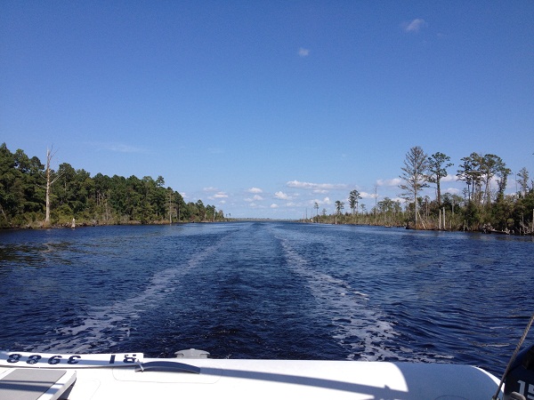 A nice view of downtown Elizabeth City as we left this morning.  The water was glass smooth. As we head south, we are making a good 7kts which is good.  Interestingly, when I left LI Sound Pandora’s bottom had not been cleaned for about a month and the best speed that I was able to get with 2,000 RPM was only about 6.4kts.  Now that I have gone all the way to Annapolis and now down to North Carolina, we are doing a bit over 7kts with the same RPM.  That suggests that the light slime that had built up on the bottom has been worn off by the passing water.