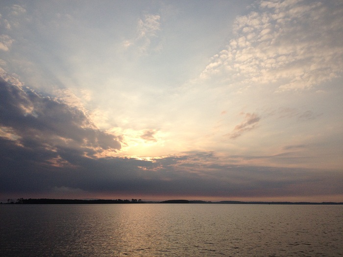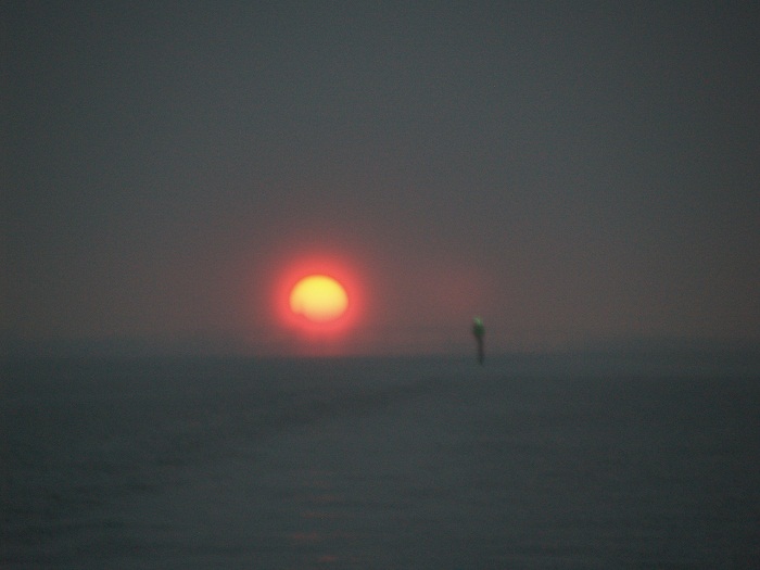 This morning it was raining lightly as we headed out and the sunrise was quite stunning. The goal for today is to put us near Cape Fear where we will jump out behind a cold front which is supposed to exit the coast there around mid-day Saturday for our 250nm run to St Mary’s, a run that should take us about a day and a half.  The wind is expected to be pretty strong, and from behind us, for perhaps as much as 24 hours and then it will become much lighter.   All of this suggests that we will have to motor-sail for at least part of the time.  However, we will surely make much better time, and hopefully sail for a good while, than being in the ICW. Hopefully, the winds will remain behind us and not go toward the south until we make port in St Mary’s