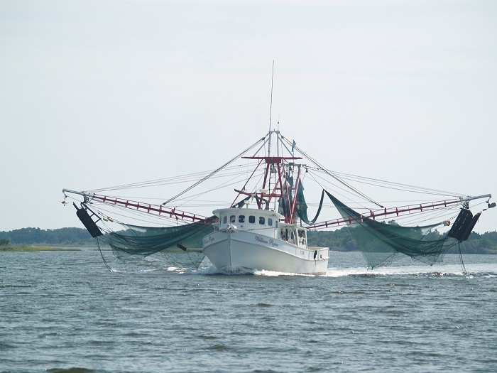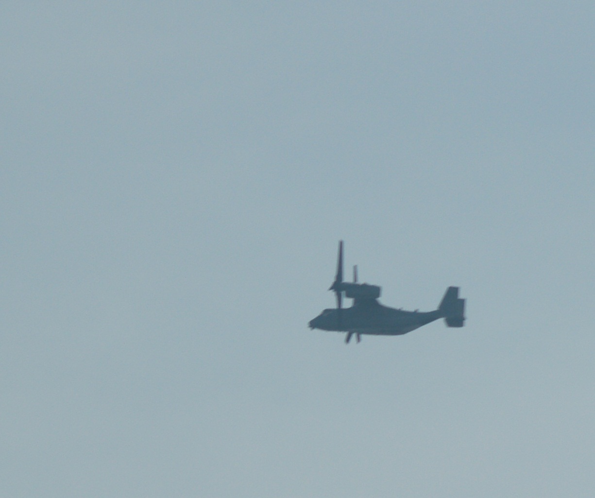 A few minutes ago we were passed by an Osprey VTOL aircraft, that’s “Vertical Take Off and Landing”.  These are sort of a high-bred of a prop plane crossed with a helicopter.  Their huge rotors are vectored vertically for takeoff and then are rotated forward to fly like a regular plane.  The design has been plagued by problems from the start, with quite a few crashes over the years but continue to be in service.   Never the less, they look amazing flying by.  Too bad they didn’t get closer.   I guess you’ll have to use your imagination.  No wait, I cropped it.  That’s not too bad.  Yes?The waterway here is flanked by miles of marsh grass on both sides.  The color of the grass is quite dramatic against the overcast sky.  Like the other canals on the ICW, this area is carved out of swamp and the channels go on for miles without a bend. Shrimping is big business in these parts.  This guy passed us in really narrow channel with his nets set out to dry.  A very impressive sight.  It looked like some sort of massive insect.  Well, it’s time for lunch so I had better wrap it up.  Hopefully, the weather will hold out for our run, beginning on Saturday.