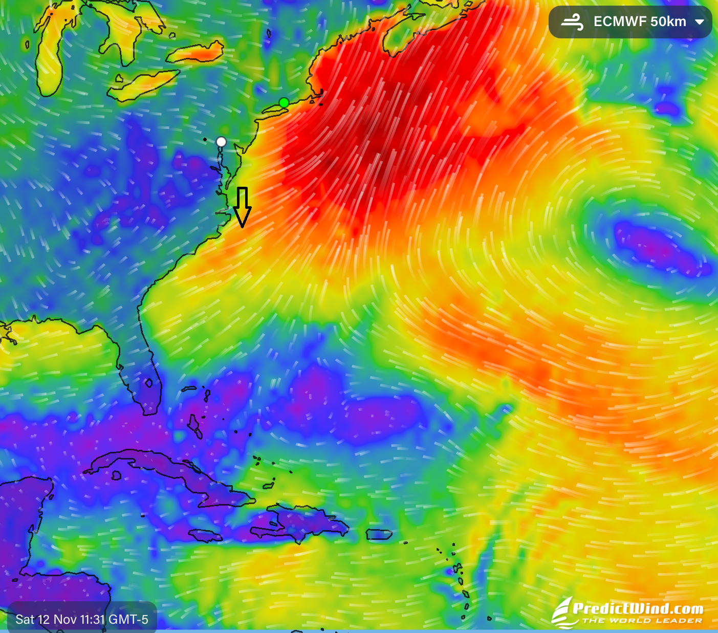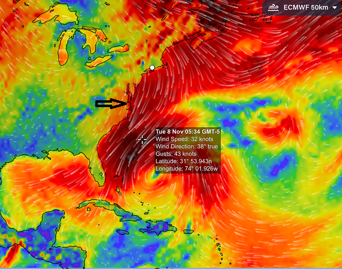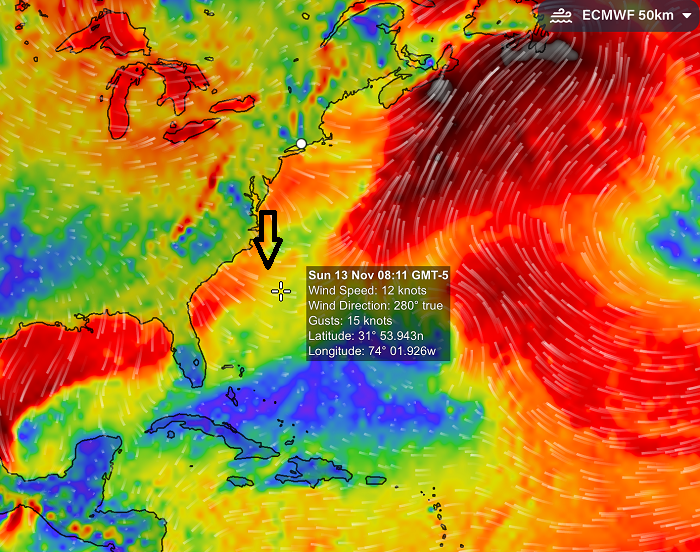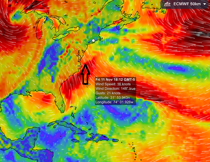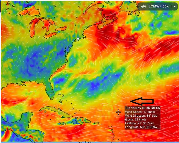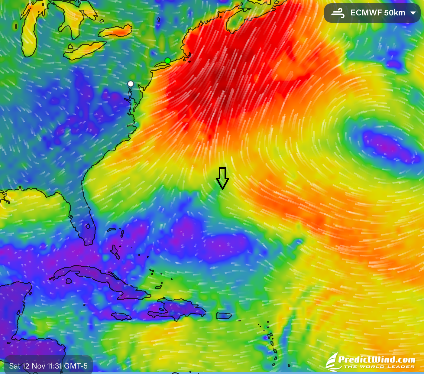 We listened intently as he described conditions that I had never encountered as we saw really strong persistent southerly winds in the eastern Caribbean, a late season hurricane spooling up in the central Caribbean and a huge low crashing toward Bermuda, all at the same time.