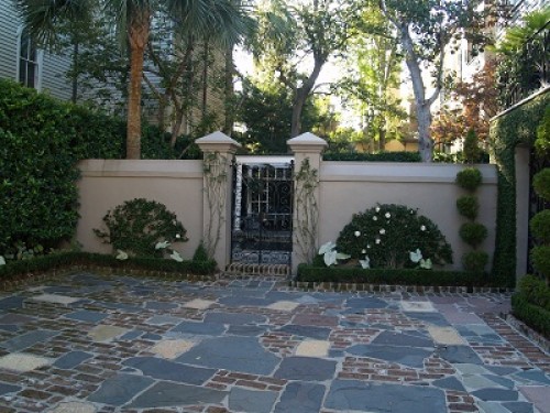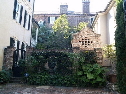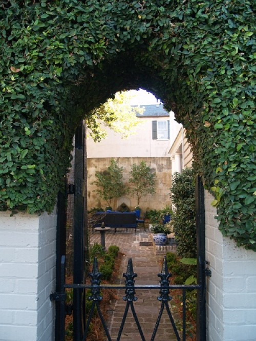 It’s amazing to see just how scenic Charleston is. The level of detail that goes into everything is inspiring. In lusting after the gardens I do have to remind myself about the cost of all this. However, taking pictures is cheap so here goes. We were told that when a gate is let open to the street it means that the owner is welcoming you to explore their gardens. Alas, on a Saturday with loads of tourists, no gates open. These photos were taken through a hole in the gate or bars. Most of the best gardens we saw were very compact and some, like this one, surround a driveway.