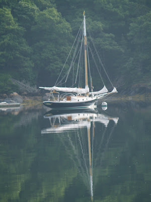 A lovely little Friendship Sloop, the sort that used to be used for lobstering in this part of Maine years ago, reflected on millpond still waters.