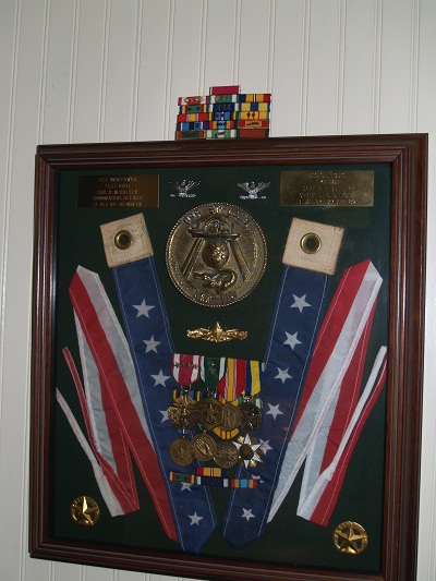 Perhaps the most elegant room in this amazing home is a diminutive bedroom up in the loft that Rick designed and built to look like a ship’s cabin. The room has bunk beds just like you would see on a ship. Notice the wainscoting on the walls. The room doubles as a place to keep artifacts from his time as skipper of ships in the Navy including commissioning pennant from his commands.