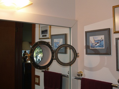 Among the many details in their home, Rick was once given a porthole by a friend. The gift was contingent on Rick promising to use it in the finishing of their home. After much thought, Rick decided to install it in the one room in the house without a water view, the bathroom. So, he had the mirror over the sink specially cut and now there is a water view, all 10″ of it that you can see as you brush your teeth.