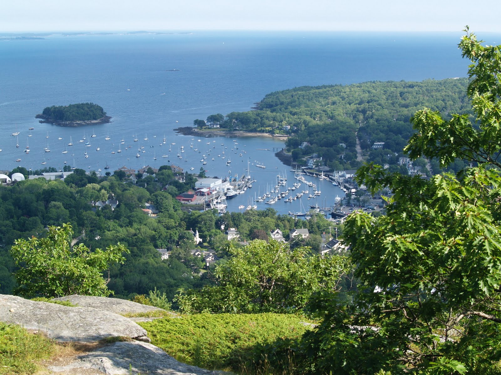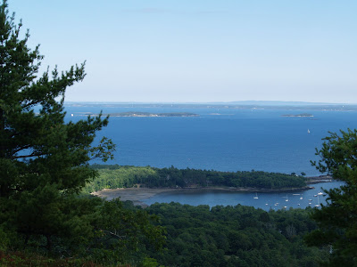 >Last evening I decided to make a quick run up to the top of Mt. Battie overlooking Camden Harbor. Mt Battie is one of a group of mountains called the Camden Hills and has some large granite ledges that you can stand on that provide magnificent views of Penobscot Bay. On a clear day, and Thursday was clear, you can see Mt Desert and out into the Gulf of Maine. It’s wonderful. This is a view to the east. In the distance you can see Mt Desert as a bump on the horizon.