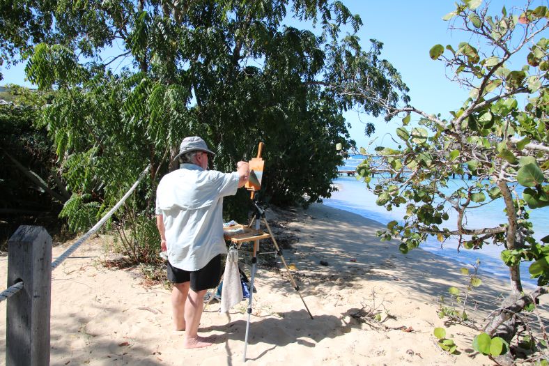 Here’s Keith painting on nearby Pigeon beach this morning.