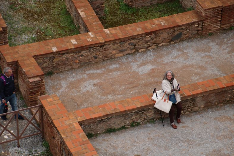 Some of the areas were not fully restored. These are the remains of troop barracks. In the lower right is Brenda in her white raincoat. She opted to sit it out when I climbed up to the highest tower.