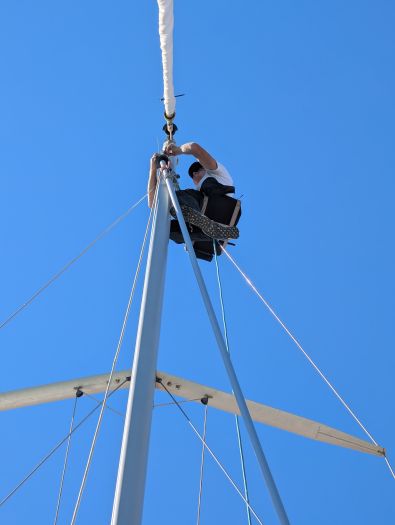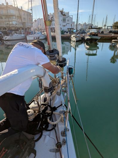 Next, I hired a rigger, to address the failed roller furler that broke when Brenda and I hauled up the jib and after he installed the new furler and headstay, we worked out a way for the sail to be adjusted so it set well. According to the sailmaker, we only lost 5% sail area. Not a lot but not great as we are now in the low wind “Motorterranean”. The good news is that the furler did not fail when we were underway which turned out to be good timing. It took more than a week to get the new unit here but it is all fixed now.