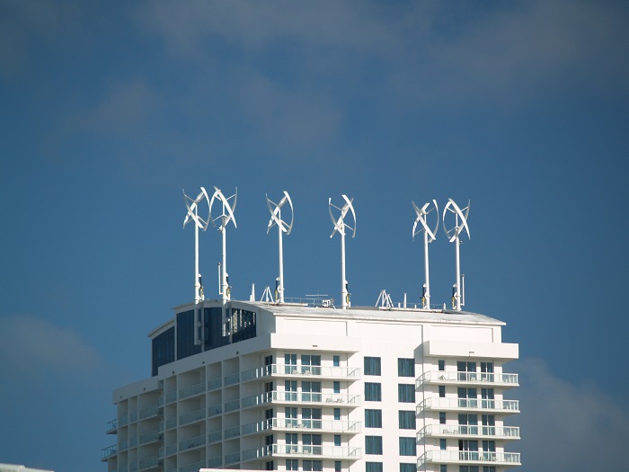 With all the sunshine here in Florida, you’d expect to see solar panels. We didn’t really see any but did see these wind generators or mills on the top of an apartment tower. They look pretty wacky but were churning away making electricity.