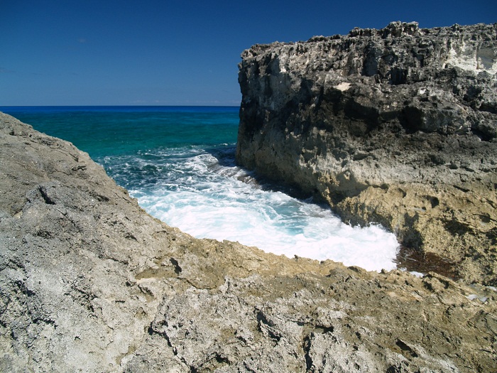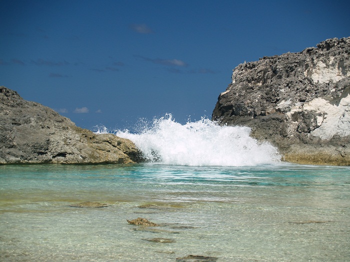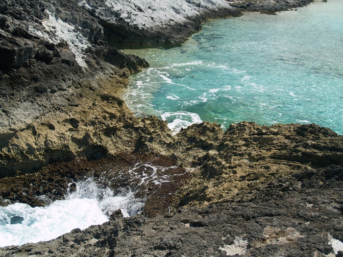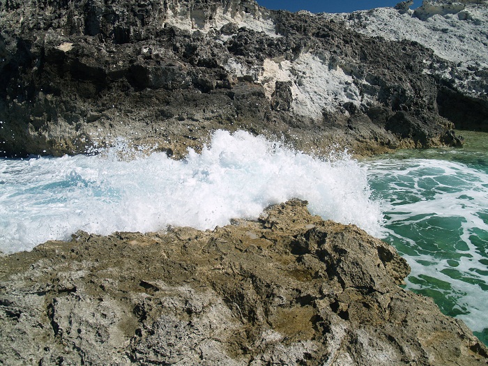 The “bubble bath” is small salt water pool that is not attached to the ocean on the north end of the island. Ocean swells coming from the north are funneled into a narrow area cut in the rock. As the cut narrows, the waves build up much higher than you’d expect. At the head of the cut there is an area that is above the tide but low enough so that the water just sloshes up and over the reef. Then the “foam” pours over into a protected pool on the other side in a fountain of white.