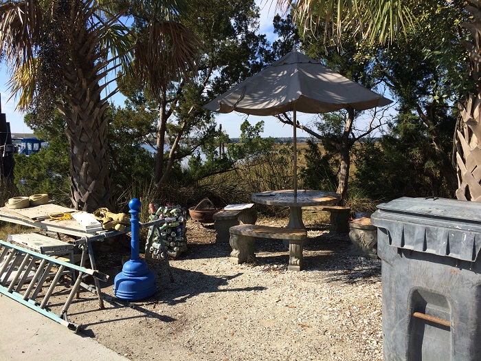 In addition to being very accommodating, the yard provides something that I have never seen in a yard and that’s really fine boarding stairs which I understand are made right in the yard. The design is quite nice, compliments of Rocky’s creative bent. In fact, they would fit right in as boarding stairs at a small airport. These staircases are made of galvanized steel with wooden treads and there’s even a grate on the bottom tread to knock off the sand from your shoes. They even put a door mat at the bottom. Very nice. How’s this for a “real” boarding ladder?And, if you want to enjoy the view and have a beer at the end of a long day of boat chores, there’s even a sitting area, complete with palm trees.