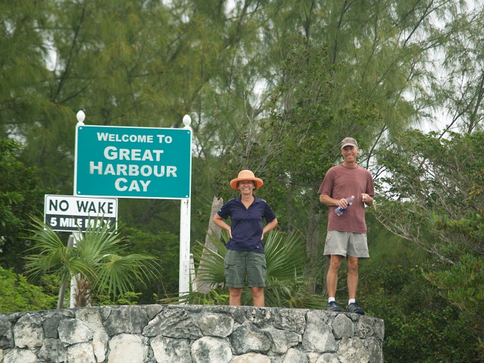 The only entrance to this harbor was carved out of the limestone. It’s very narrow and about 15′ deep. It’s pretty daunting to approach it as it is so tight. If it weren’t for the waypoint to steer for on the Explorer Charts and the welcome sign at the entrance, you’d never find your way in. Yes, there’s a marker but it’s tough to see unless you are quite close to the cut. A couple from another boat in the marina were surveying the cut when we arrived. “Smile for the camera.” Not hard to do at Great Harbor Cay, that’s for sure.
