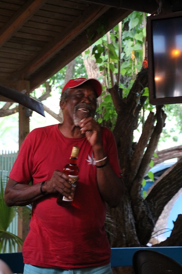 Well, we made it, we’re here and it’s beautiful. Here’s the view that greeted me as I peeked topside first thing today.We arrived last Monday in the BVI and have been pretty busy getting settled and meeting fellow cruisers through the Salty Dawg Sailing Association. They had a party at Foxy’s, the famous watering hole on Jose Van Dyke, BVI. About 50 of us enjoyed an evening together there on Thursday night. As part of the festivities, a bottle or rum, actually shots of that rum, were auctioned off to benefit the local school on the island. This is the famous Foxy himself telling a story about the charity. He’s quite a character mon.